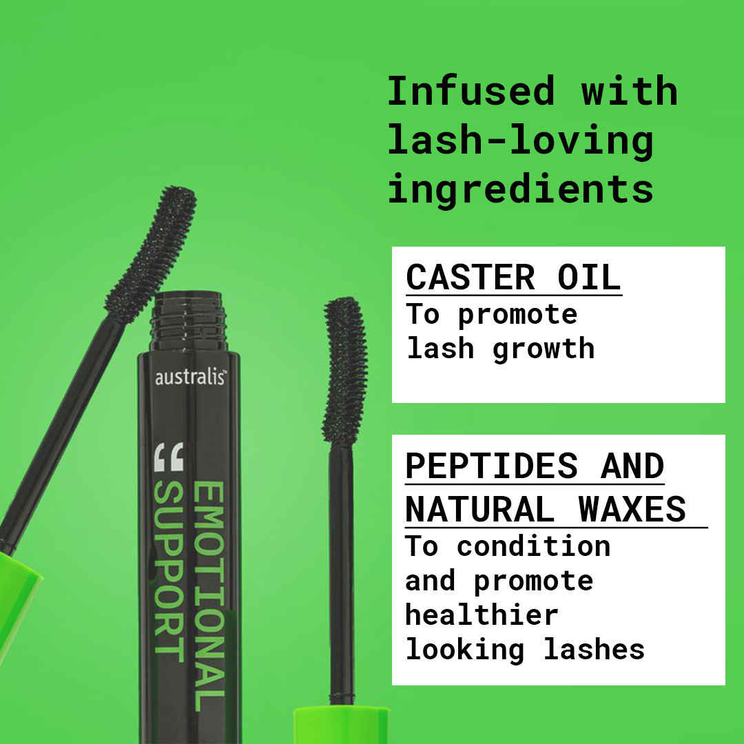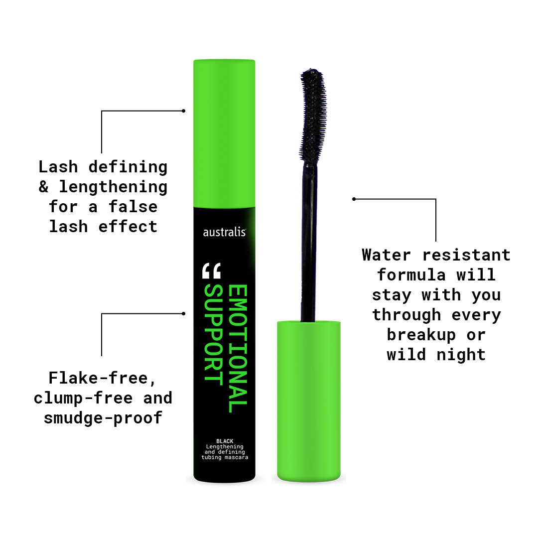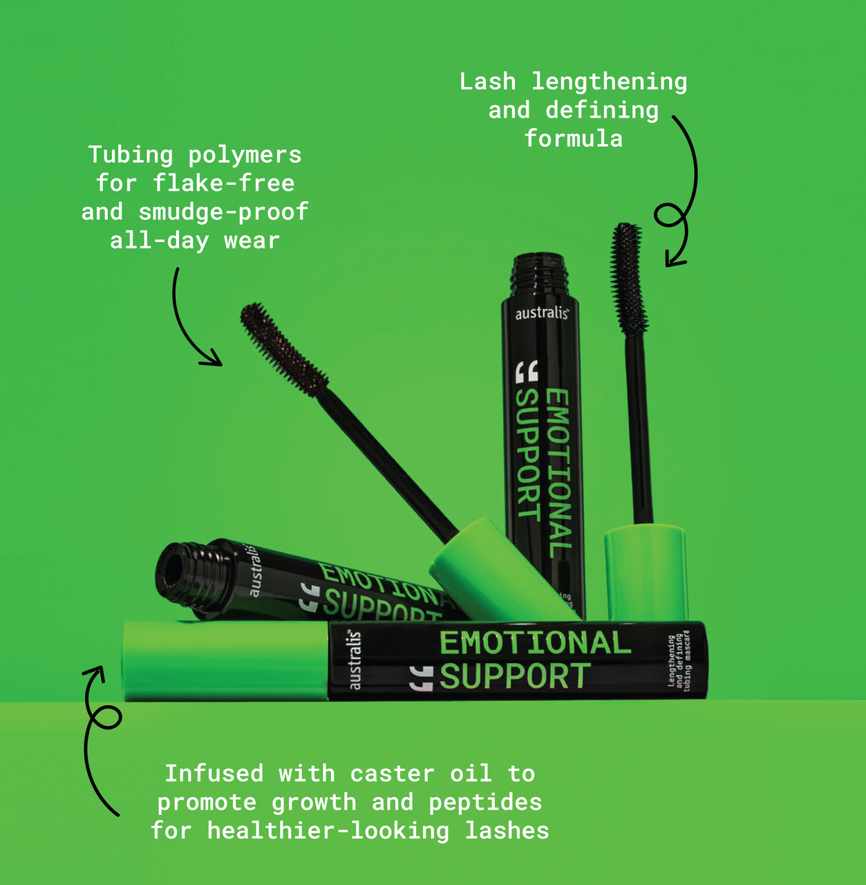 Your unwavering support through every breakup, wild night, or crisis, Emotional Support Tubing Mascara is our lengthening and defining mascara that ensures you're never alone. With innovative tubing technology, this mascara delivers all-day, flake-free, clump-free, and smudge-proof wear. Enriched with lash-loving castor oil to promote growth and infused with peptides, panthenols, and natural waxes, it conditions and enhances your lashes for a healthier, more effortless look. This revolutionary mascara is designed to be your ride or die, ensuring that your lashes stay flawless, no matter what life throws your way.