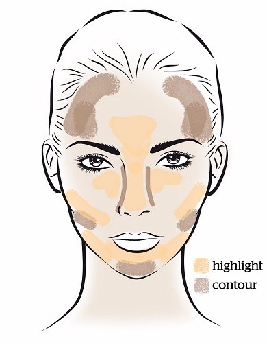 CONTOUR: For your contouring shade, start with your chin, underneath your cheekbones, down the sides of your nose and finally from the end of your brow and up around your hairline.