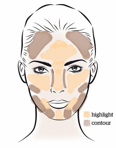 CONTOUR: Start the contour on each side of your chin where you just put your highlighter. Then continue the contour up the sides of your jawline and cheekbones. Draw a line down each side of your nose, and then finish the contour by drawing along your hairline around your highlight.
