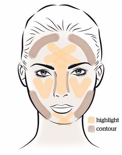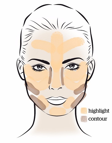 HIGHLIGHT: Starting from the top, take the highlighter from the middle of one brow, in a semi-circle, over to the other brow, then fill in the space. From here, draw a line down the middle of your nose and join the two. You can then fill in the space under your eyes, at the corner of your lips and finish by drawing a line down the middle of your chin.