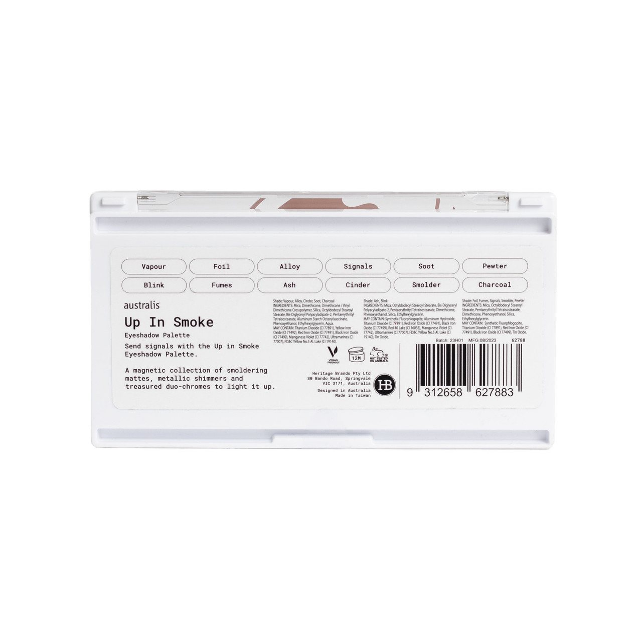 Ingredients: Mica, Dimethicone, Dimethicone / Vinyl Dimethicone Crosspolymer, Silica, Octyldodecyl Stearoyl Stearate, Bis-Diglyceryl Polyacyladipate-2, Pentaerythrityl Tetraisostearate, Aluminum Starch Octenylsuccinate, Phenoxyethanol, Ethylhexylglycerin, Aqua. May Contain: Titanium Dioxide (CI 77891), Yellow Iron Oxide (CI 77492), Red Iron Oxide (CI 77491), Black Iron Oxide (CI 77499), Manganese Violet (CI 77742), Ultramarines (CI 77007), FD&C Yellow No.5 Al. Lake (CI 19140). Shade: Ash, Blink Ingredient: Mica, Octyldodecyl Stearoyl Stearate, Bis-Diglyceryl Polyacyladipate-2, Pentaerythrityl Tetraisostearate, Dimethicone, Phenoxyethanol, Silica, Ethylhexylglycerin. May Contain: Synthetic Fluorphlogopite, Aluminum Hydroxide, Titanium Dioxide (CI 77891), Red Iron Oxide (CI 77491), Black Iron Oxide (CI 77499), Red 40 Lake (CI 16035), Manganese Violet (CI 77742), Ultramarines (CI 77007), FD&C Yellow No.5 Al. Lake (CI 19140), Tin Oxide. Formula#